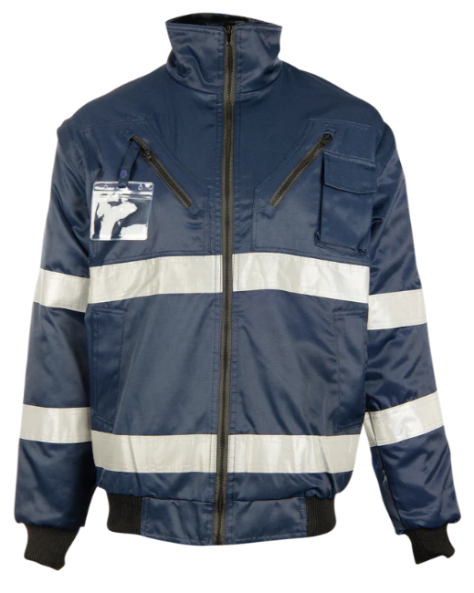 Heavy-duty polyester/cotton jacket with detachable sleeves, fleece lining, and reflective tape for warmth, comfort, and safety in cold conditions.